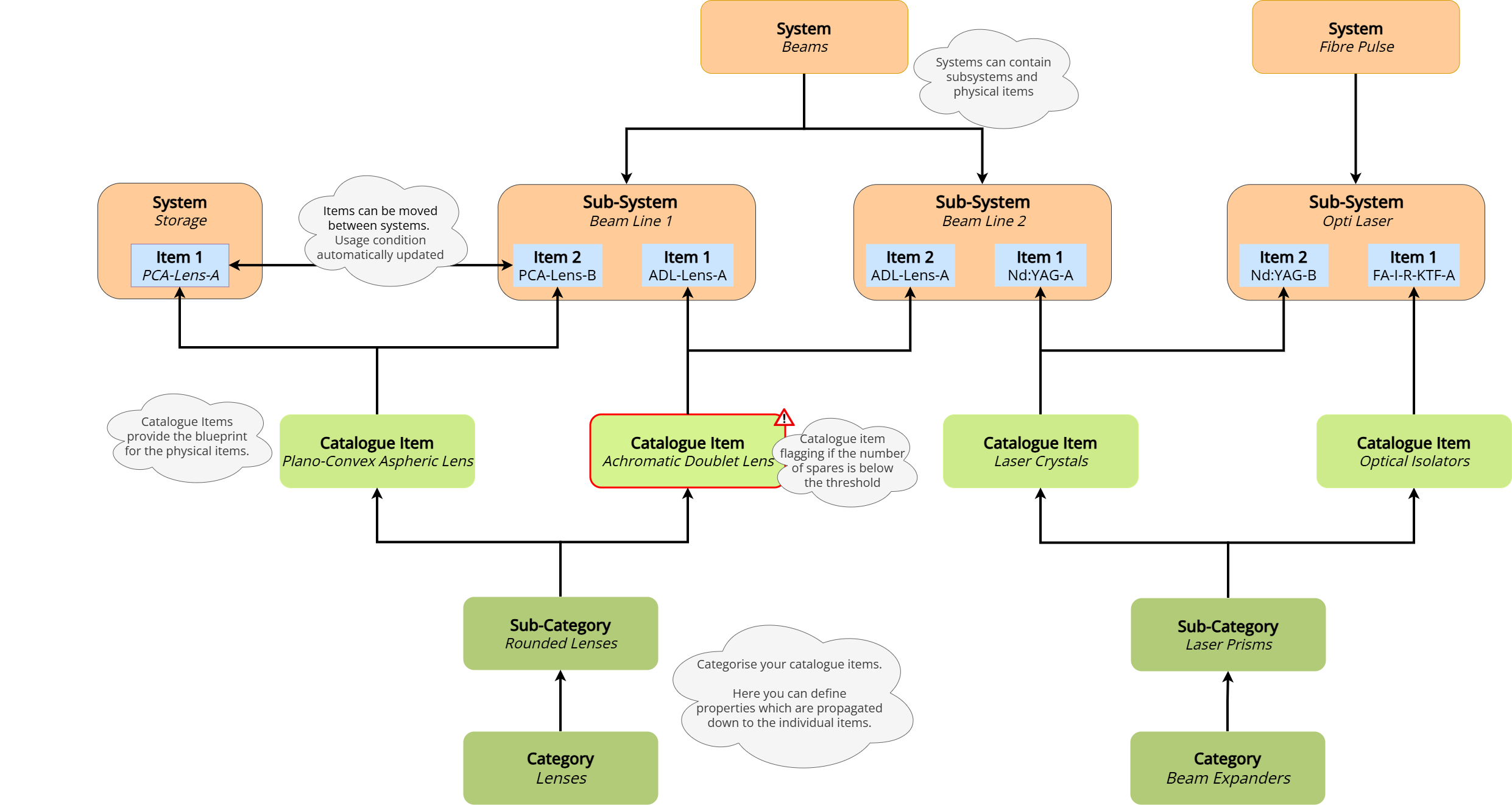IMS structure overview: Detailed categorisation, for catalogue items and systems. Items which can move dynamically between systems. Our solution provides a comprhensive overview of your inventory.Applications